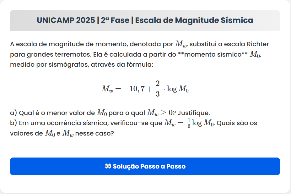 Continue lendoUNICAMP 2025 | Matemática | 2ª Fase | Escala de Magnitude Sísmica UNICAMP 2025 | Matemática | 2ª Fase |