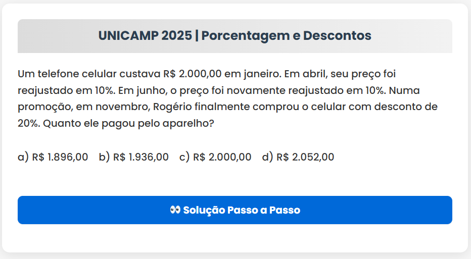 Continue lendoUNICAMP 2025 | Matemática | 1ª Fase | Porcentagem e Descontos UNICAMP 2025 | Matemática | 1ª Fase | Porcentagem