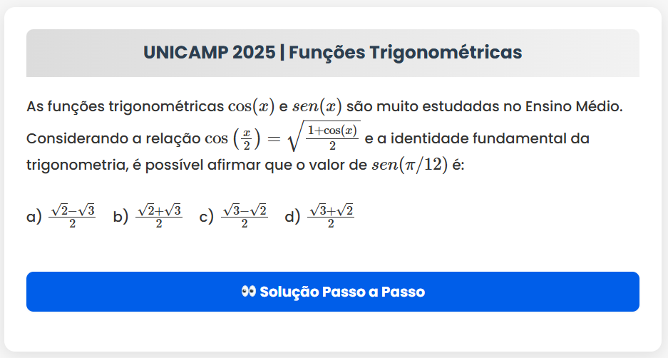 Continue lendoUNICAMP 2025 | Matemática | 1ª Fase | Funções Trigonométricas UNICAMP 2025 | Matemática | 1ª Fase | Funções Trigonométricas