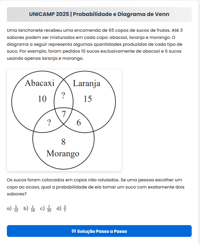 Continue lendoUNICAMP 2025 | Matemática | 1ª Fase | Probabilidade e Diagrama de Venn UNICAMP 2025 | Matemática | 1ª Fase