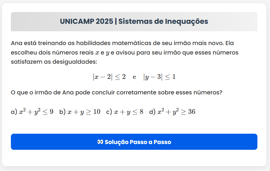 Continue lendoUNICAMP 2025 | Matemática | 1ª Fase | Sistemas de Inequações UNICAMP 2025 | Matemática | 1ª Fase | Sistemas