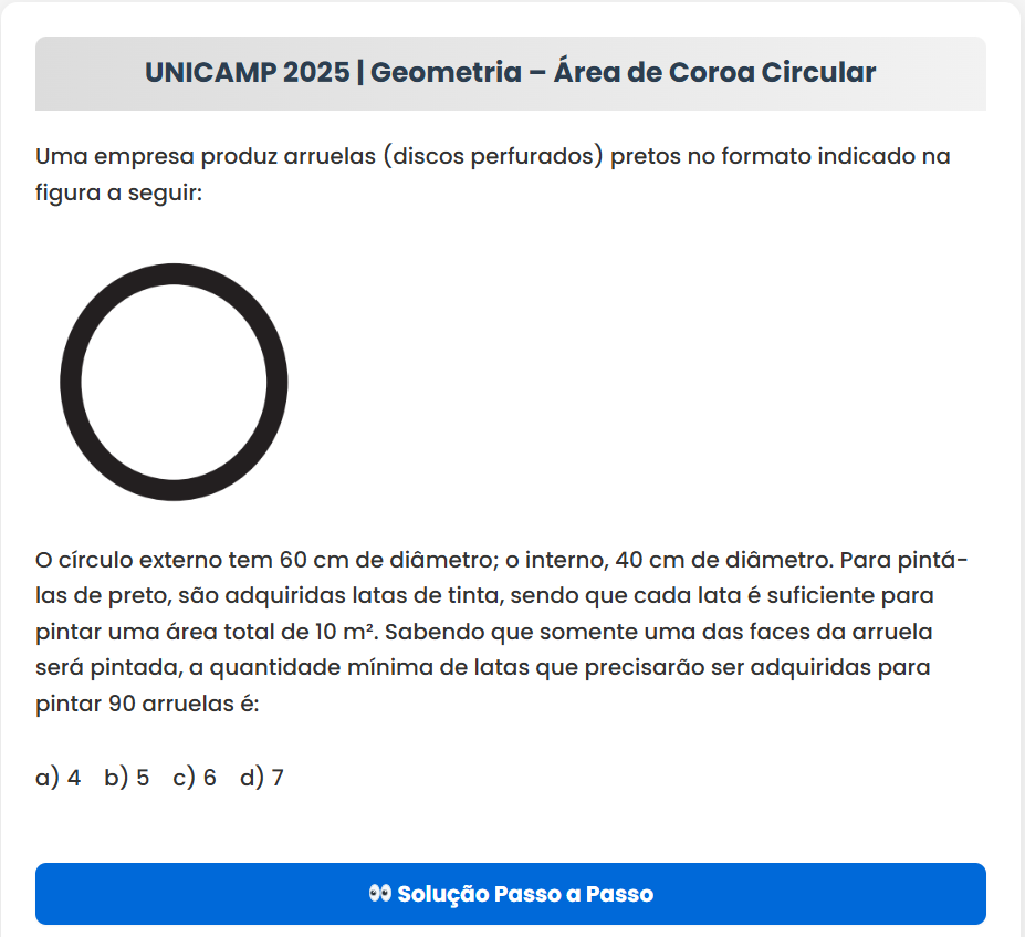 Continue lendoUNICAMP 2025 | Matemática | 1ª Fase | Geometria – Área de Coroa Circular UNICAMP 2025 | Matemática | 1ª