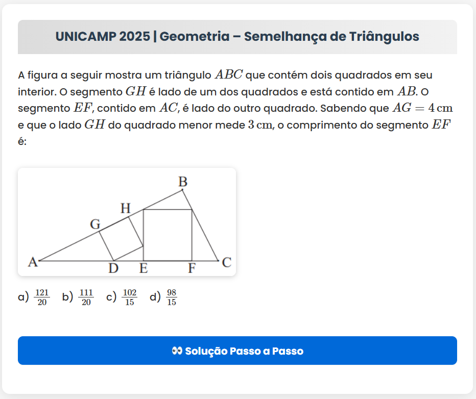 Continue lendoUNICAMP 2025 | Matemática | 1ª Fase | Geometria – Semelhança de Triângulos UNICAMP 2025 | Matemática | 1ª Fase