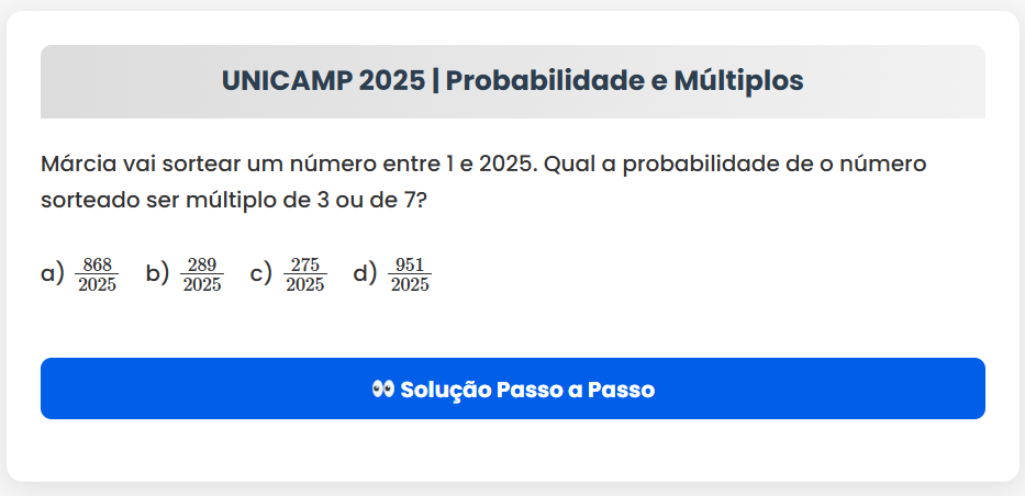 Continue lendoUNICAMP 2025 | Matemática | 1ª Fase | Probabilidade e Múltiplos UNICAMP 2025 | Matemática | 1ª Fase | Probabilidade