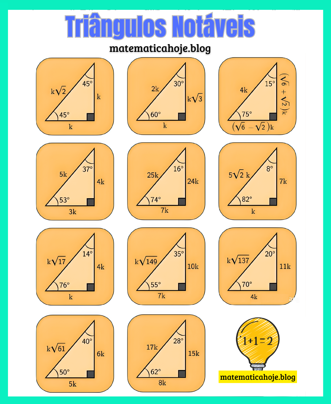 - Aproximados: pares como 37°–53°, 16°–74°, 8°–82° etc., usados para estimativas rápidas.